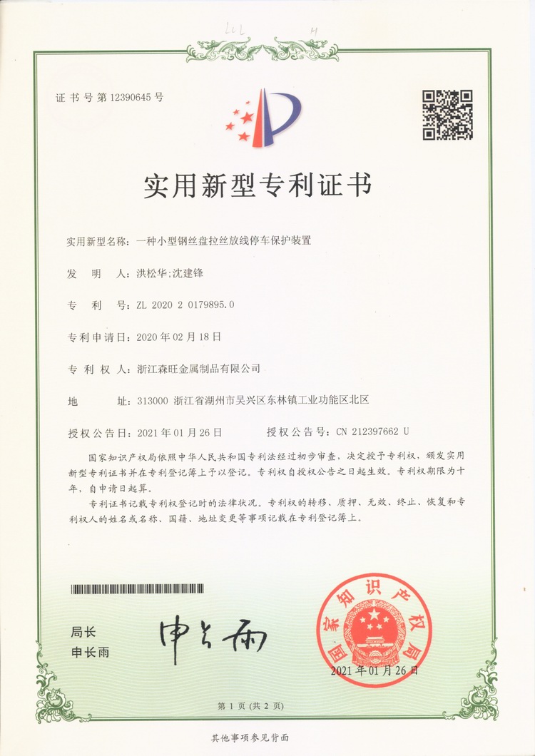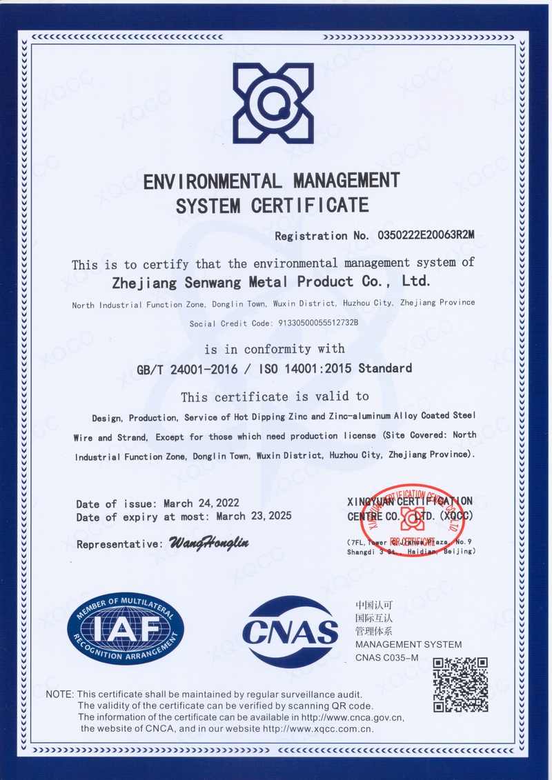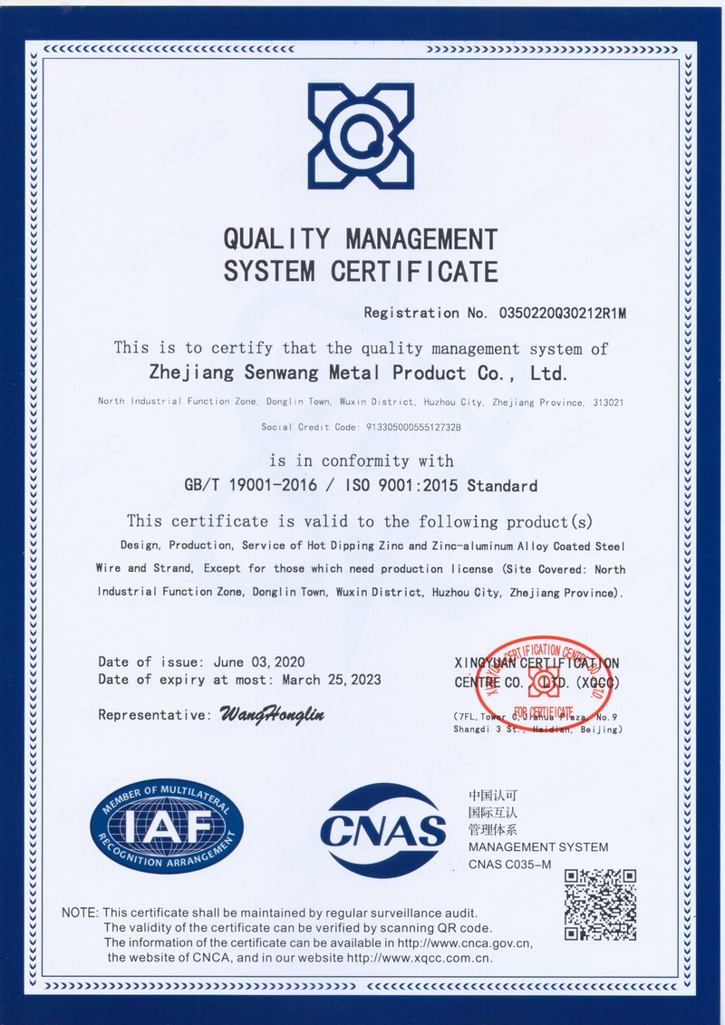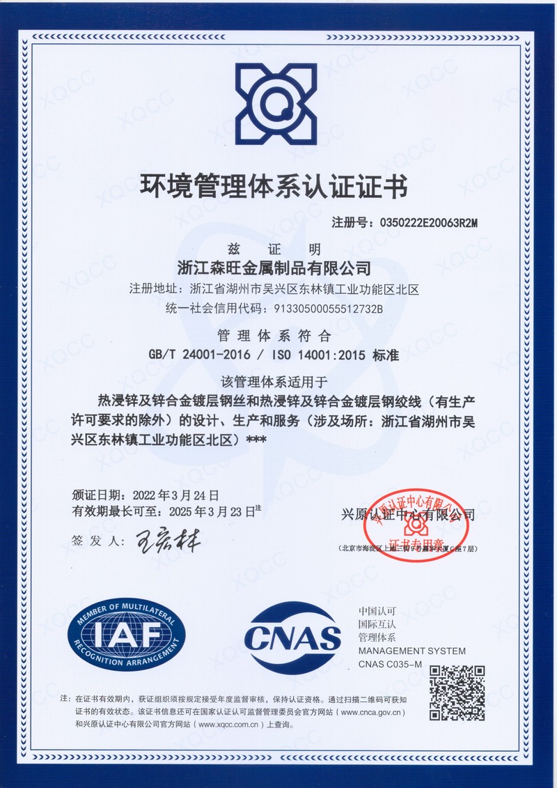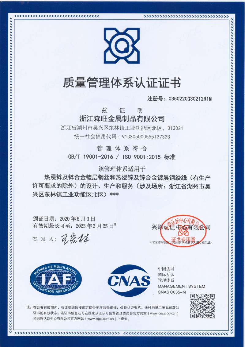浙江森旺金屬制品有限公司成立于2012年,坐落湖州市吳興區(qū)東林鎮工業(yè)功能區(qū)。公司專業(yè)從事各類鍍鋅鋼絲、鋼絞線等產品的開發(fā)及生產。目前產品已廣泛應用于各類通信光電纜,電力輸送,電氣化鐵路工程,各類堤壩防護及農業(yè)溫室等工程領域。公司秉承“追求卓越品質,創(chuàng)建卓著信譽”的經營理念,始終堅持專業(yè)化、規(guī)模化的經營模式。